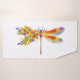 Artistically painted, floral dragonfly in contrasting orange and purple with yellow, bright, blooming California poppy and blue wildflowers on white background.