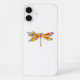 Artistically painted, floral dragonfly in contrasting orange and purple with yellow, bright, blooming California poppy and blue wildflowers on white background.