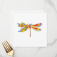 Artistically painted, floral dragonfly in contrasting orange and purple with yellow, bright, blooming California poppy and blue wildflowers on white background.