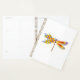 Artistically painted, floral dragonfly in contrasting orange and purple with yellow, bright, blooming California poppy and blue wildflowers on white background.