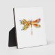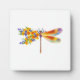 Artistically painted, floral dragonfly in contrasting orange and purple with yellow, bright, blooming California poppy and blue wildflowers on white background.