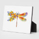 Artistically painted, floral dragonfly in contrasting orange and purple with yellow, bright, blooming California poppy and blue wildflowers on white background.