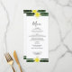 This design features yellow Frangipani / Plumeria flowers. A tropical design elegantly framed with yellow Frangipani flowers and its leaf greenery. The bride's and groom's names are emphasized with the matching green colour from the leaves. The reverse of the design mimics the other side. These popular tropical Hawaiian flowers are ideal for a rustic destination beach wedding. Tropical wedding menu card design with modern elements. Matching wedding invitations and other stationery items are also available.