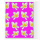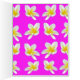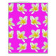 Featured on a pink background are yellow Frangiapani flowers in a pattern.
