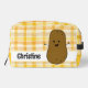 Adorable toiletry bag featuring a cute happy cartoon brown potato. The background is a cute classic pattern of yellow and white watercolor check gingham. A template to add your name to personalise.