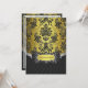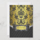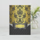 Yellow Gold & Black Damask Wedding Invitations---match the RSVP cards found at the bottom of this page. Each invitation features an elegant, chandelier like damask print in black and a golden yellow at the top with a luxury pillow print, also in black at the bottom. The top and bottom half are seperated by a brown and black ornamental band for added flair. The band has a template that allows the groom & bride's first names to be printed on top of it. These gold chandier/black damask wedding invitations are set to high quality basic card stock; however, you can change the stock to linen, felt (embossed), recycled, and several metallic shades if you would like under number 2 (choose your style, size & paper type) below the orange add to cart button. A list of the additional costs for a fancier card stock are displayed also under that option. Each invitation comes with a fitted white envelope.