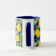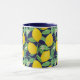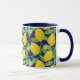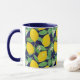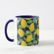 Decorative design of a pattern of yellow juicy lemons on branches with green leaves and delicate white flowers on a navy blue background.