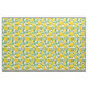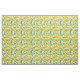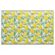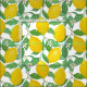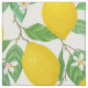 Decorative design of a pattern of yellow juicy lemons on branches with green leaves and delicate white flowers on a white background.