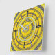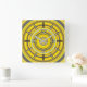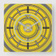 This square clock design features a pattern of nested circle shapes coloured various shades of colours like yellow and grey. It also features rectangles marking the hours, and numbers indicating the hours "12", "3", "6", and "9".