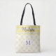Our custom monogram tote bag is adorned with a grey and yellow stripe and geometric print and white frame for your initial. Customise with your name and initial. View our full line of products in our Zazzle store.