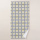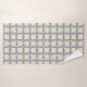Elegant vintage bath towel set design featuring a seamless pattern made of geometric shapes in yellow, white, light grey and dark grey.