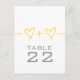 Cute and whimsical Heart Equation Wedding Table Number Postcard in yellow featuring a fun math equation "joining" two hearts/people. This nerdy design is a charming choice for a math loving couple or any couple wanting something simple but with a hint of whimsy. Easy to customise, simply add the appropriate table number(s) in the space provided. Click "Customise It" to find more personalisation options.