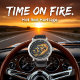 This bold watch face prominently features a yellow hot rod car with custom red and black flames painted on its side. The car is depicted on a dark road, with vibrant orange and yellow flames erupting from the ground beside it, resembling fire in grass. Dark, stylised clouds are visible in the background, creating a powerful, intense automotive scene.