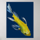 From an original artwork painting in watercolour by Sacha Grossel of a yellow Japanese koi painted in free form Asian style brushwork. This decorative and ornamental fish can be set against a customised background - it is shown here in traditional Japanese navy blue. Good Feng Shui - This painting is for koi and fish and Japanese art lovers everywhere.