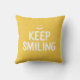 A colourful motivational quote throw pillow with a cheerful text design that says Keep Smiling in yellow and white.