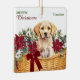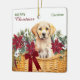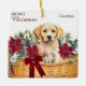 Here's a pretty Holiday ornament that would make a great gift for a grandchild, son, daughter, or anyone. Both sides of the ornament have an image of a basket of red poinsettia blossoms, white flowers, and pine bough sprigs. In the middle sits an adorable yellow Labrador Retriever puppy. The wicker basket is decorated with a red bow. The front has green and red text that says "Merry Christmas, and a name. The back has your signature and the year.
