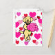 Cheery and smiling Yellow Labrador is holding Pink Rose Bouquet! Girly pink hearts background. Unique and funny Labrador Retriever Cartoon created by Naomi Ochiai from Japan. Send this card to Yellow Labrador fans!