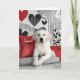 Yellow Labrador Valentine's card. Cuddly canine set against a contemporary background in red, black and white. No flowers, just hearts and bags of cuteness.