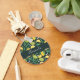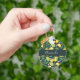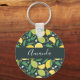 A key chain with a cute pattern featuring yellow lemons and green lime fruit with stalks of leaves set on a dark green background.