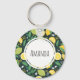 A key chain with a cute pattern featuring yellow lemons and green lime fruit with stalks of leaves set on a dark green background.