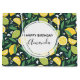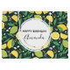 A birthday gift bag with a cute pattern featuring yellow lemons and green lime fruit with stalks of leaves set on a dark green background.