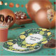 Paper plates with a cute pattern featuring yellow lemons and green lime fruit with stalks of leaves set on a dark green background.