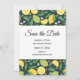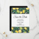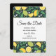 Save the date card with a pattern featuring lemons and lime fruit with stalks of leaves set on a dark green background.