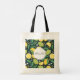 Tote bag with a cute pattern featuring yellow lemons and green lime fruit with stalks of leaves set on a dark green background.