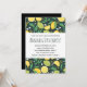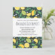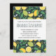 Baby shower invitation with a pattern featuring lemons and lime fruit with stalks of leaves set on a dark green background.