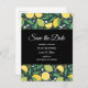 Save the date postcard with a pretty pattern featuring lemons and lime fruit with stalks of leaves set on a dark green background.