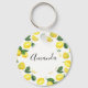 A keychain with a cute pattern of yellow lemons with green leaves and fresh cut lemon slices. A white circle layered over top with your text inside.