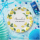 Birthday / event paper plates with a cute pattern of yellow lemons with green leaves and fresh cut lemon slices. A white circle layered over top with your text inside.