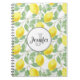 A spiral notebook personalised with a monogram initial and name inside a white circle with a black rope border. Designed with yellow lemons and green leaves, in a repeating pattern.