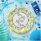 A paper plate designed with yellow lemons and green leaves, in a repeating pattern. In the centre is a white circle with a tea cup and kettle with the words: Tea Time.