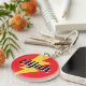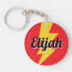 Yellow lighting bolt strike flash logo custom name Keychain. Powerful zigzag thunderbolt design with personalized text. Red or custom background color.