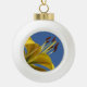 Close up photo of a beautiful yellow lily against a clear blue sky.