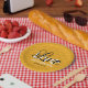 Stylish yellow LIVE ABUNDANTLY John 10:10 Christian Paper Plates for Christian events based on an Abundant Life theme. Design shows white and black typography against a gamboge yellow background. There is a tiled pattern saying John 10:10. These Christian paper plates would make a great addition to your party supplies. Matching items and gifts available.