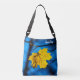 Image of a single yellow maple leaf on a twig against the dark blue background. One-of-a-kind trendy cross-body tote bag. Customisable. You can change or delete the template text Ashley.
