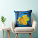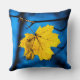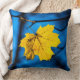 Image of a single yellow maple leaf on a twig against the dark blue background. One-of-a-kind square throw pillow.