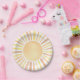 This cheerful paper plate design features a classic watercolor sun at the center, with warm rays in shades of yellow and orange for a soft and timeless look. The hand-painted style gives it a gentle, playful feel that works beautifully for a variety of celebrations. Whether you're planning a “Little Ray of Sunshine” or “Here Comes the Son” baby shower, a “First Trip Around the Sun” birthday, or simply want to add a lighthearted summer vibe to your party, this design brings a bright and joyful touch to the table.