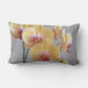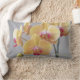 The artwork on this Lumbar Pillow is an original photograph by ZoeSPEAK of orchid flowers, specifically P. Chain Xen Queen, Yellow/Red Lip. The photo is a closeup, a detailed view of the light yellow flower petals surrounding deep red lips at the blooms' centres. There is also a touch of lavender before the petals turn to yellow. The background surrounding the orchids is a white fabric in shadowy shades of light grey. In the lower corners of the design there are words in script of a light golden colour. The script reads "Yellow Orchid" on one side of the pillow, and "Orchidée jaune" (which is "Yellow Orchid" in French) on the other side of the pillow.