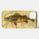 This print illustrates an artistic picture of a yellow perch fish. The background displays a vintage geographic map in light beige colors. The brown frame resembles old wood pattern with yellow-red flowers in the edges. A great addition to your fishing collection!