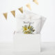 Floral wedding favour bags to say “thank you” to guests. Yellow and white plumeria flowers design with text above and below the realistic bunch of flowers. Include names of the bride and groom with wedding date. White bags come in sets of 50 in two paper types.