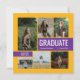 Stylish graduation announcement card and party invitation features six senior photos with "GRADUATE" as a large focal point. Personalise the modern custom text with your grad's name, school, and class year. This two-sided card design includes graduation party invitation wording on the back. Customise the colours of the picture frame and boxes on the front and the boxes on the back to match your school colours or coordinate with the photography. Available in the most popular and common school colour combinations - green/yellow, red/yellow, crimson/gold, blue/yellow, navy/gold, black/gold, black/yellow, purple/yellow, red/silver and red/black. Matching products and other colours available.