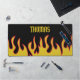 Add some fire to your office decor with this desk mat. It features illustrations of classic flames in yellow and red against a black background for a tough, manly look. Your name or other message is in golden yellow lettering.