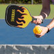 Show off your hot pickleball skills with this personalised paddle. This pickle ball paddle features illustrations of flames in yellow and red set against a black background and is ready to be personalised with a name or other text in bold yellow lettering.