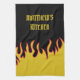 Create a personalised kitchen towel with a manly look. This towel features illustrations of flames in yellow and red set against a black background with your message in bold yellow lettering. Makes a great housewarming gift for men moving into their own apartment or bachelor pad.