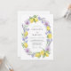 A vibrant watercolor design featuring bright yellow lemons nestled among lush green foliage and delicate purple orchids. The Mediterranean-inspired palette combines zesty citrus tones with soft lavender and periwinkle accents. This fresh botanical aesthetic evokes a sunny summer afternoon atmosphere, perfect for an outdoor Mediterranean or Italian-themed event.