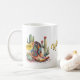 Pretty Texas souvenir mug with graphics of pretty colourful cowgirl boots, cactus and yellow roses. Text, on the front of the mug reads, Yellow Rose of Texas, and can be personalised to read what you want.