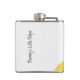 The flask itself is fine. It’s a cheap flask, obviously bought in bulk, however am prepared to overlook that. Given that it is a personalized item, I would have liked to have seen gift boxing instead of the generic packaging. Terrible printing, and/or quality. It’s a cheap, tacky vinyl. It is not cut straight and is also applied in a way that it is overhanging the bottom, causing the glue to catch on items and it will eventually roll and tear, damaging the wrap.